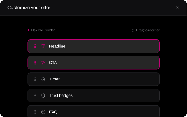 CartHook's post-purchase offer builder has no trust badges, no FAQs, no progress bar, and no urgency countdown timer. Aftersell gives your team full drag-and-drop control over every conversion element on the post-purchase page: trust badges, FAQs, countdown timers, progress bars, GIFs, and rich content blocks — all no-code.