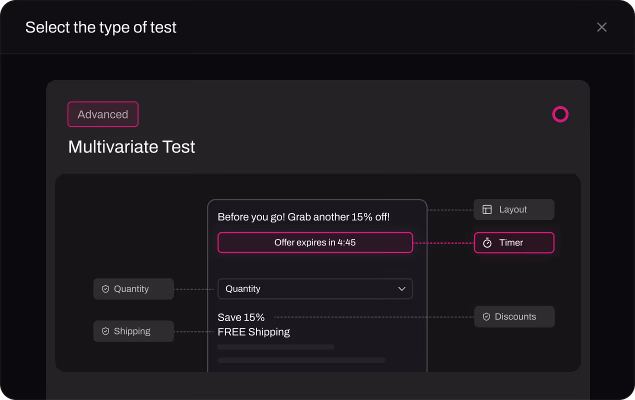 Aftersell's native A/B and multivariate testing supports up to 6,000+ offer variations — across pricing, copy, layout, and product combinations — without dev work. The experimentation depth performance teams need to find and scale what works, faster.