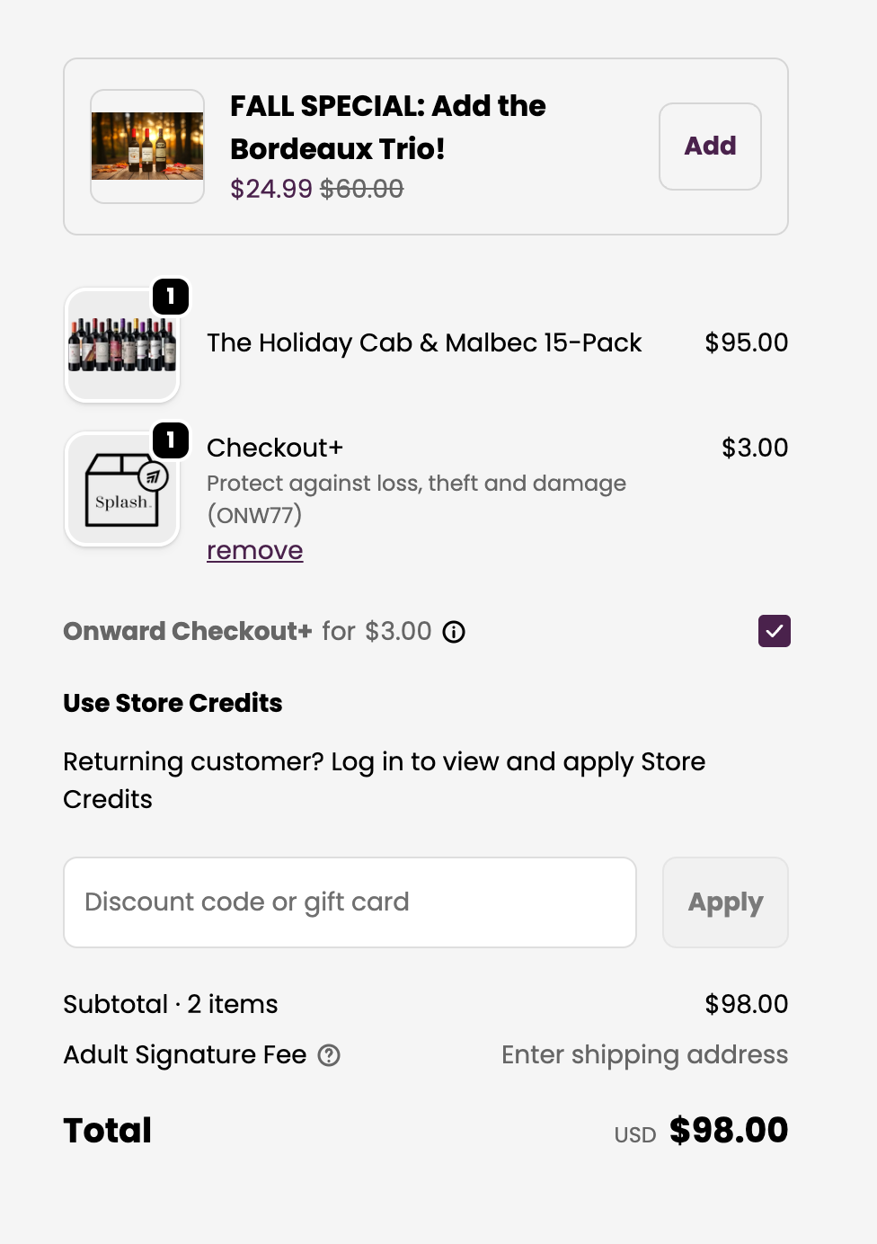 Splash Wines is a great example that puts this into practice seamlessly. As customers check out their wine bundles, they’re offered the option to protect their order against loss, theft, and damage. They make the upsell feel like more of a safeguard, ensuring the wine arrives exactly as it should, rather than an extra cost.