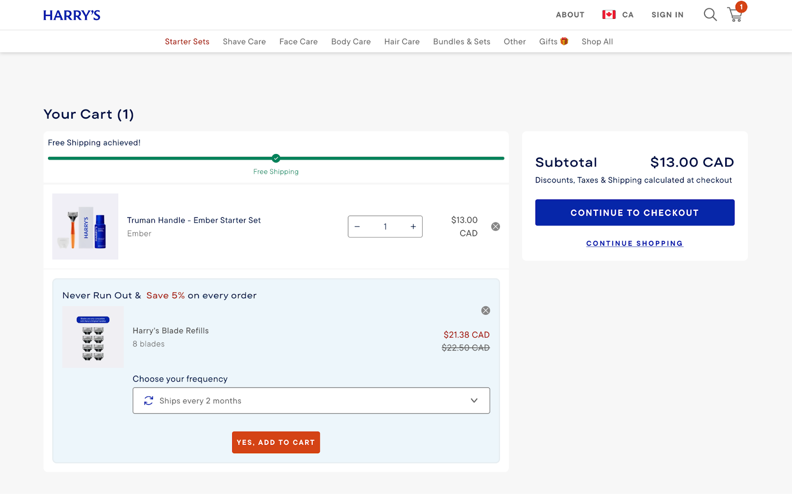 How does this look IRL? Harry’s prompts shoppers to subscribe to razor blade refills directly in the cart. Customers already have a starter bundle, so the offer is a straightforward way to save 5% on every order.