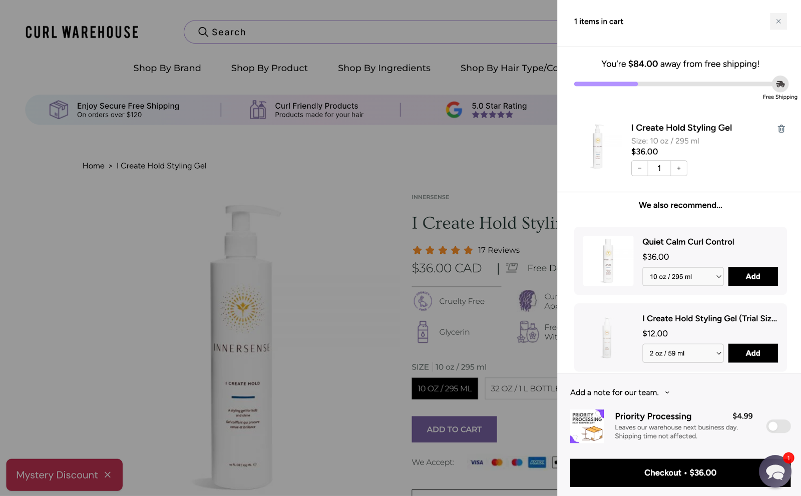 Curl Warehouse executes this cleanly by displaying a progress bar directly in the cart, showing customers exactly how close they are to free shipping. Complementary products appear with one-click add-to-cart options, making the final step toward the threshold feel easy and almost inevitable.