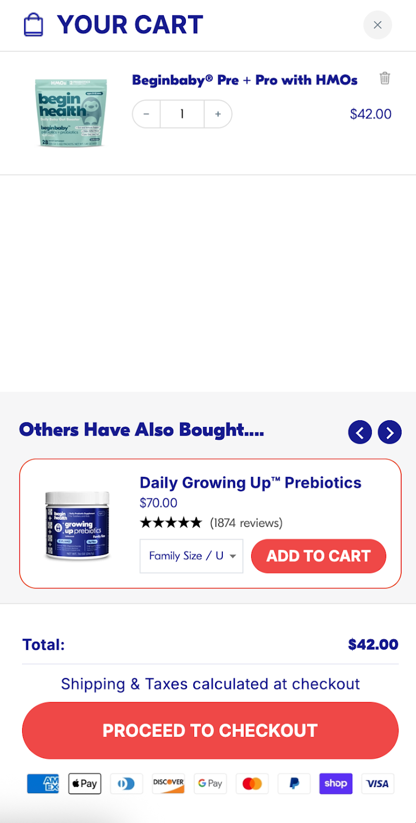 Begin uses cart upsells with Aftersell’s sister app, Upcart, to present relevant add-ons at the moment customers are already committed to buying.