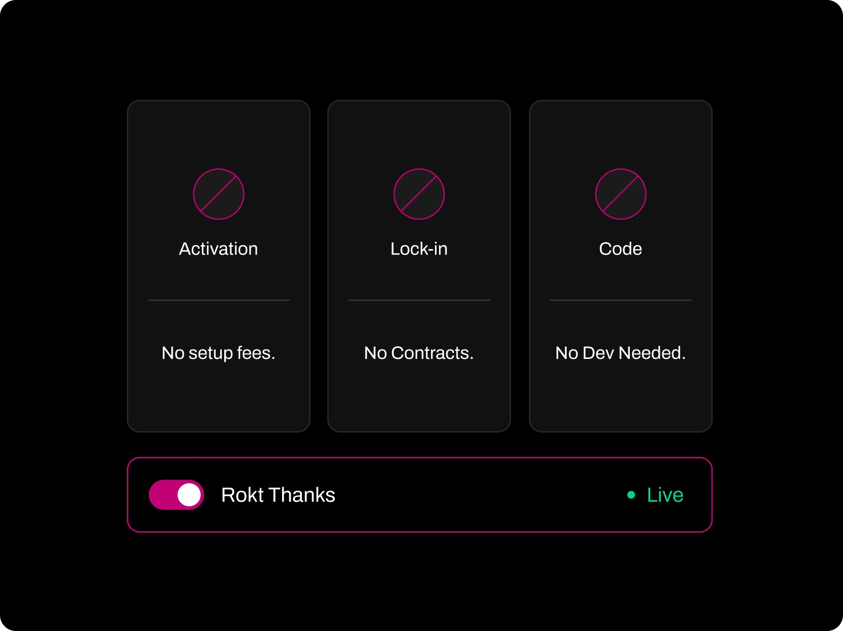 Rokt Thanks turns your Order Confirmation Page into a net-new profit center—generating $0.30–$0.50 in pure profit per order with zero dev lift, no cost, and no impact on CX.